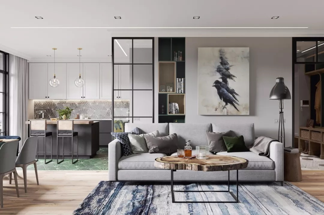 時下流行的隔斷形式有很多,黑框玻璃門是非常理想的功能分區的辦法。它時尚、精致、“隔而不斷”,而且會讓整個空間都有明亮通透的感覺。