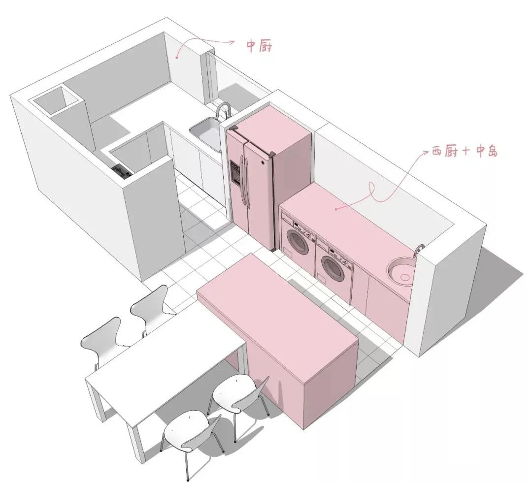 在家庭布局方面,西廚最理想的位置一般都是在中廚與餐廳之間,這樣可以照顧到兩頭的需求,具體的形式針對不同的戶型可以有多種調整。